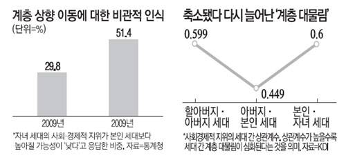 실제로 경제 격차가 큰 사회일수록 사회이동성(social mobility·개인의 계층적 지위가 변화하는 정도)이 약하다는 사실은 이미 수많은 연구를 통해 입증됐다. 문제는 빈부격차가 심해지며 한국 사회의 계층 간 이동 역시 시간이 지날수록 단절되고 있다는 점이다. 한국보건사회연구원이 지난해 전국의 만 19세 이상, 75세 이하 성인 남녀 4052명의 '주관적 계층 평가'를 분석한 결과 계층 상승이 어려워진 것은 가장 최근인 정보화 세대(1975~1995년생)에서 더욱 두드러졌다. 이들 중 한 세대가 지나면서 '하층→중상층· 상층'으로 계층이 오른 경우는 2.9%에 불과했다. 이는 11%를 기록한 민주화 세대(1960~1974년생)에 비해 크게 떨어지는 수치다. 연구진은 "한국의 사회이동 추세는 급격한 감소를 특징으로 하고, 그 추세가 최근 들어 더욱 심각해지고 있다"고 진단했다. 미래에 대한 전망은 더욱 암울하다. 같은 조사에서 '본인 세대에 비해 자식 세대의 사회·경제적 지위가 오를 가능성'을 물은 결과 '가능성이 낮다'고 응답한 비율이 절반 이상으로 나타났다. 이는 2009년 29.8%에서 크게 오른 수치다.