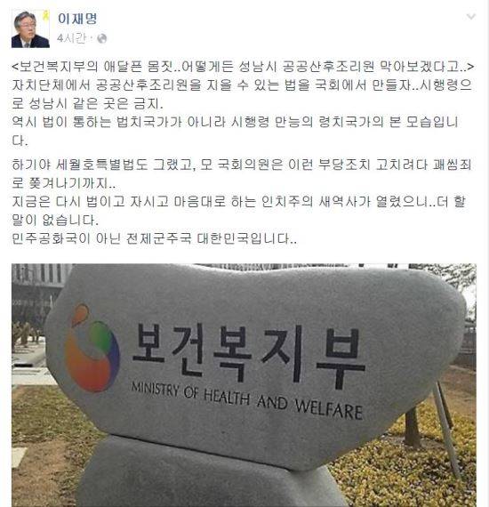 이재명 성남시장은 4일 자신의 페이스북을 통해 “보건복지부의 애달픈 몸짓”이라며 “어떻게든 성남시 공공산후조리원 막아보겠다고”라고 했다.