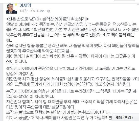 이재명 성남시장은 5일 자신의 페이스북을 통해 “산은 산으로 남겨야..설악산 케이블카 취소하라!”라고 주장했다.