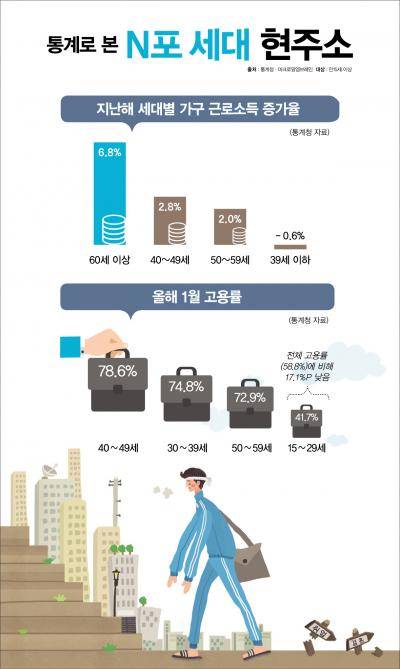 통계청이 지난 8일 발표한 '2015년 연간 가계동향'을 보면 가구주가 39세 이하인 전국 2인 이상 가구의 지난해 월평균 소득은 431만6000원으로 2014년(433만9612원)보다 0.6% 줄었다. 20~30대 가구의 소득 감소는 2003년 관련 조사가 시작된 이후 처음이다.