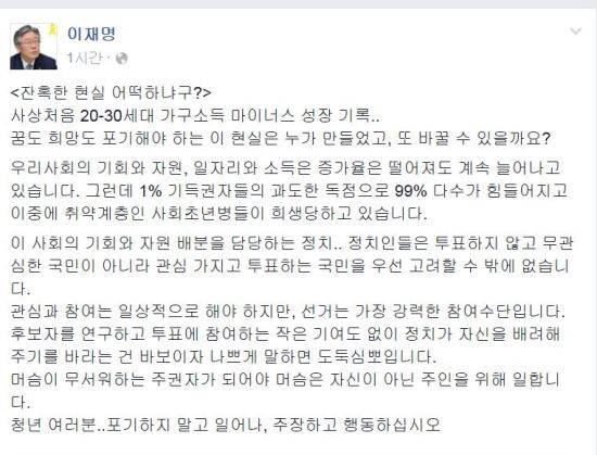 이재명 성남시장은 15일 자신의 페이스북을 통해 “잔혹한 현실 어떡하냐구?”라는 글을 올렸다.