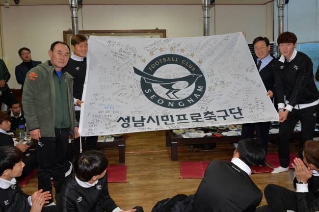 선수단은 박수와 함께 “수원에 성남의 깃발을 내걸자”며 결의를 다졌다. 이시장은 ‘소고기 한턱’으로 화답했다.