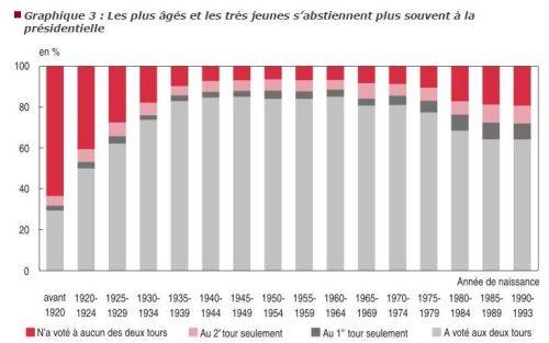 | ▲ 2012년 프랑스 대선 세대별 투표율. 1985~1993년생 유권자 중 1차, 2차 투표에 모두 참여한 유권자는 65% 남짓이다. |