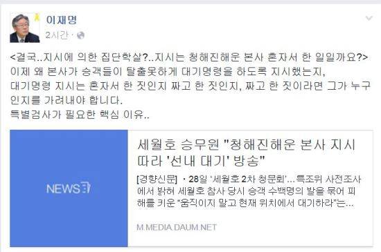 이재명 성남시장은 28일 자신의 페이스북을 통해 “결국..지시에 의한 집단학살?..지시는 청해진해운 본사 혼자서 한 일일까요?”라고 되물었다.