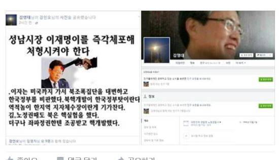 이재명 성남시장은 31일 자신의 페이스북을 통해 “이재명 총살처형 하겠다는 현직 경찰간부..나라가 미쳐갑니다”라고 적었다.
