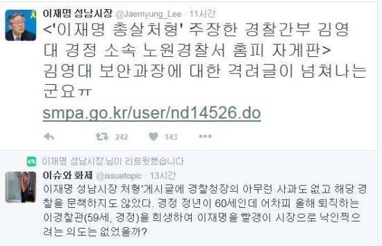 이재명 성남시장은 2일 자신의 트위터를 통해 “'이재명 총살처형' 주장한 경찰간부 소속 노원경찰서 홈피 자게판”이라며 “김모 과장에 대한 격려글이 넘쳐나는군요ㅠ”라고 했다.