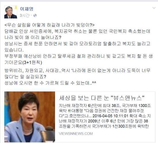 이재명 성남시장은 6일 자신의 페이스북을 통해 “무슨 살림을 어떻게 하길래 나라가 빚덩이?”라고 했다.
