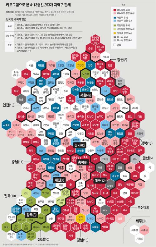 - 서울 10곳이상 우세 정당 없어.. 경기 60곳 중 38곳 경합