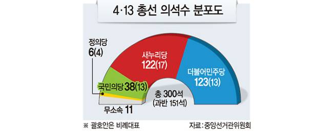 [헤럴드경제=이형석 기자]국민의 ‘심판’은 무서웠고, ‘선택’은 냉철했다. 아무도 예상못한 결과였다. 새누리당이 과반 달성에 실패한 것은 물론 제 1당의 자리마저 빼앗겼다. ‘오만의 정치’에 대한 심판이다. 국민과 불통하고 일방 독주했던 박근혜 정부와 최악의 공천파동을 벌였던 여당을 향한 심판엔 자비와 동정의 여지가 없었다. 과오에 대해선 저지른만큼 것만큼 단죄했고, 가진 것만큼 빼앗았다. 19대 총선에서 152석을 얻었던 새누리당은 20대에선 122석을 얻어 30석이 줄었다.