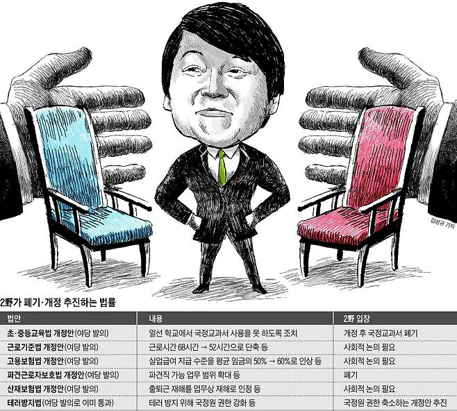더민주는 지난해 여야(與野) 갈등의 최대 쟁점이었던 역사 국정교과서 문제와 관련해 일선 학교에서 국정교과서 사용을 금지하는 내용의 초·중등교육법 일부 개정안을 발의해 놓은 상황이다. 이 개정안이 국회에서 통과되면 정부가 행정명령으로 추진하고 있는 국정교과서 작업은 '법률 우위 원칙'에 따라 자동 폐기될 수밖에 없다. 안철수 대표도 더민주 탈당 전인 지난해 10월 국정교과서와 관련해 '수구로의 회귀' '박근혜 교과서'라며 반대했었다.