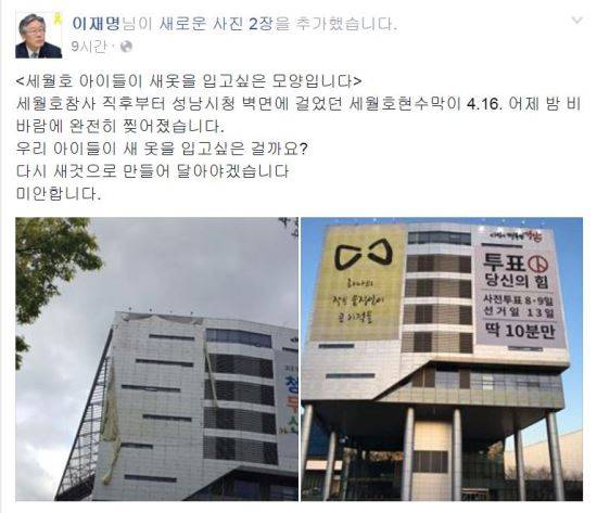 이재명 성남시장은 18일 자신의 페이스북을 통해 "세월호참사 직후부터 성남시청 벽면에 걸었던 세월호 현수막이 4.16. 어제 밤 비바람에 완전히 찢어졌습니다"라고 했다.