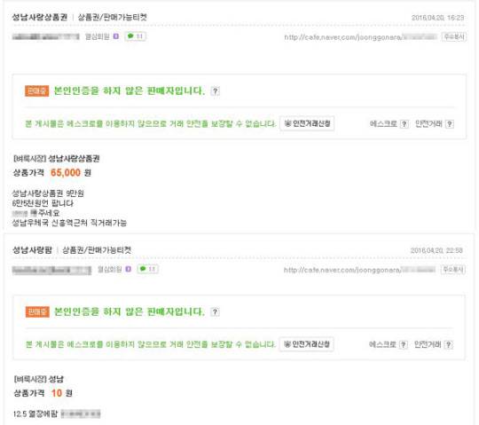 성남시가 2분기 청년배당을 20일 시작하자 인터넷 포털 사이트 유명 중고물품 거래 사이트에는 상품권을 20~30% 할인해 판매한다는 글이 올라왔다. 한 이용자는 ‘성남사랑팜’이라는 제목의 게시물을 올리고 ‘12.5 열장에팜’이라고 적었다. 12만5천원어치 성남사랑상품권을 20% 할인해 현금 10만원에 판다는 뜻이다. 다른 사용자는 9만원어치 성남사랑상품권을 30% 싼 6만5000원에 판다며 성남우체국 신흥역 근처에서 직거래 가능하다는 게시물을 올렸다.
