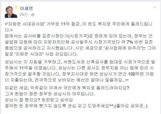이재명 성남시장은 27일 자신의 페이스북을 통해 "'지방판 사대강사업' 거부로 11억 절감..이 돈도 복지로 주민에게 돌려드립니다"라고 적었다.