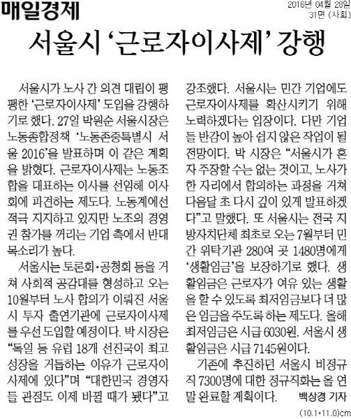 반면 매일경제는 “서울시가 노사 간 의견 대립이 팽팽한 근로자이사제 도입을 강행하기로 했다”고 보도했다. 한겨레 기사 제목은 <서울시 ‘노동존중 특별시’ 선언>이었으나 매일경제 기사 제목은 <서울시 ‘근로자이사제’ 강행>이었다. 노동이란 단어는 빠지고 강행이란 단어가 강조됐다. 매일경제는 “서울시는 민간 기업에도 근로자이사제를 확산시키기 위해 노력하겠다는 입장”이라고 전한 뒤 “기업들 반감이 높아 쉽지 않은 작업이 될 전망”이라고 보도했다.