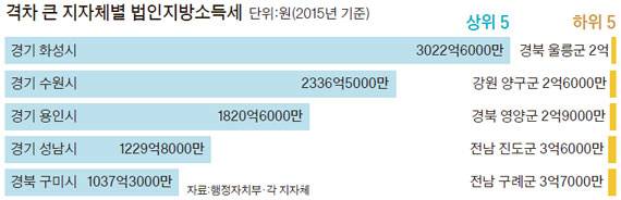 행자부는 법인지방소득세의 시·군 간 세수 격차가 커서 개선이 불가피하다는 입장이다. 예컨대 화성시의 지난해 법인지방소득세는 3023억원으로 가장 적은 경북 울릉군(2억원)과는 1510배나 차이가 난다. 경기도에서도 최하위인 연천군은 9억3000만원으로 화성시의 0.3%에 불과하다.