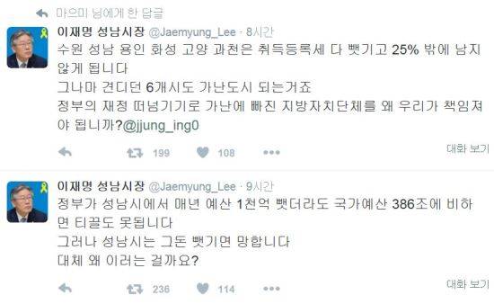 이 시장은 "기초연금 보육료 떠넘겨 지방정부 살림 거덜내놓고, 수원 성남 용인 고양 화성 과천시에서 5천억 빼앗아 3천억은 정부가 2천억은 경기도가 갖겠답니다"라고 했다.