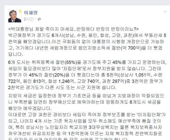이 시장은 "박근혜정부가 경기도 6개시(성남, 수원, 용인, 화성, 고양, 과천)에서 부동산세 5천억을 빼앗겠답니다"라며 "이건 국회동의 없이 대통령의 시행령 개정만으로 가능하고, 거기에다 내년엔 세법개정으로 법인지방소득세 절반(약 700억)을 더 뺏겠답니다"라고 했다.