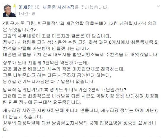 이재명 성남시장은 6일 자신의 페이스북을 통해 "박근혜정부의 재정약탈 장물분배에 대한 남경필지사님 입장은 무엇입니까?"라고 했다.