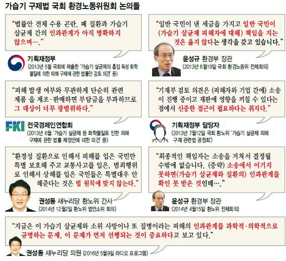 유해화학물질 규제 담당 부처인 환경부 역시 기재부와 보조를 맞춰왔다. 윤성규 환경부 장관은 피해자 구제 법안이 상정된 2013년 6월19일 환노위 전체회의에서 “현재 제출된 법안대로 일반 국민이 낸 세금을 가지고 일반 국민이 책임을 지는 것은 옳지 않다는 생각을 갖고 있다”며 피해자 ‘선지원’에 부정적인 입장을 밝혔다. 그는 2014년 4월15일 환노위 회의에서도 “최종적인 (문제의) 책임자는 소송을 거쳐서 결정될 수밖에 없다”고 말하기도 했다. 장하나 의원이 “그냥 운이 없었다, 이렇게 끝나는 문제입니까”라고 따져도 윤 장관은 “(소송에서) 패소하면 (가습기 살균제와 피해가) 인과관계가 없는 것으로 볼 수밖에 없다”고 답하기도 했다.