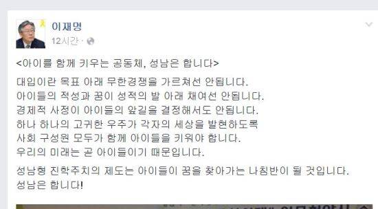 이재명 성남시장은 11일 자신의 페이스북을 통해 "아이를 함께 키우는 공동체, 성남은 합니다"라고 적었다.