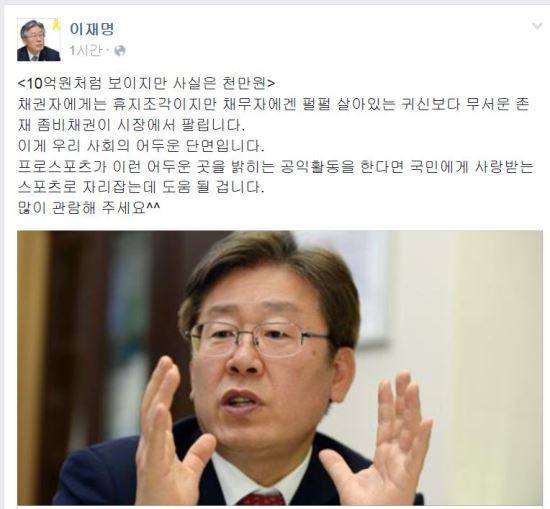 이재명 성남시장은 11일 자신의 페이스북을 통해 "10억원처럼 보이지만 사실은 천만원"이라는 글을 올렸다.