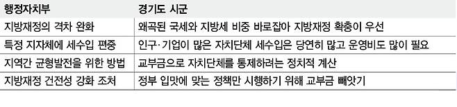 앞서 행자부는 지난달 22일 국가재정전략회의에서 2018년부터 시·군세인 법인지방소득세의 50% 내외를 도세로 전환해 시·군에 재분배하고, 조정교부금(광역자치단체가 자신이 확보한 취득·등록세 등 재원의 일부를 떼 일선 기초자치단체에 지원해주는 돈) 배분 방식을 재정이 열악한 시·군에 유리하게 변경하는 지방재정개혁 방안을 내놨다.