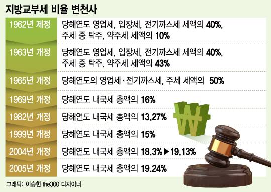 11일 국회에 따르면 지방교부세 제도가 처음 도입된 1962년에는 지방교부세의 재원은 영업세와 입장세 등 일부 세목에서 일정비율의 세금을 교부세의 재원으로 활용했었다. 이후 1968년 개정안에서 처음으로 내국세의 16%로 정하면서 현행 제도의 모습을 갖췄다.