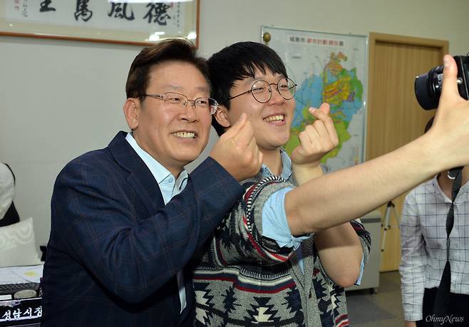 | ▲ 이재명 성남시장-청년 시민기자와 함께하는 청년정책 소통 인터뷰 지난 11일 오후, <오마이뉴스> 상근기자 두 명과 청년 시민기자 세 명(권순민, 이찬우, 유종헌)이 이재명 성남시장을 마주했다. 인터뷰를 마친 후 권순민 시민기자가 이재명 성남시장과 함께 손가락 하트 셀카를 찍고 있다. |