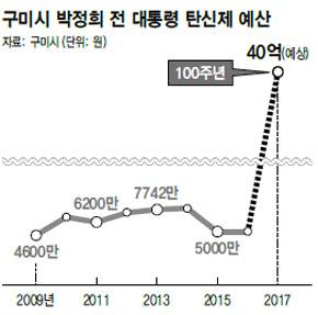 해마다 박 전 대통령이 태어난 날(11월14일)과 숨진 날(10월26일)에 각각 여는 ‘탄신제’와 ‘추모제’ 행사에 들어가는 구미시 예산도 갈수록 증가하고 있다. 2012년 추모제 예산은 686만원이었지만, 박근혜 대통령이 취임한 2013년 1470만원으로 크게 늘었다. 탄신제 예산도 2012년 7350만원에서 2013년 7742만원으로 증가했다. 구미시가 지난 7년 동안(2009~2015년) 탄신제와 추모제에 쓴 돈은 모두 5억3338만원이다. 구미시는 내년에 40억원을 들여 박 전 대통령의 ‘100주년 탄신제’를 크게 치를 계획을 하고 있다.