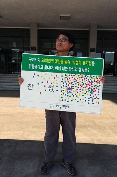 | ▲ 구미참여연대 회원이 구미시청 본관 앞에서 1인시위를 하고 있다. '박정희 뮤지컬' 찬반은 시민들에게서 받은 것이다. |