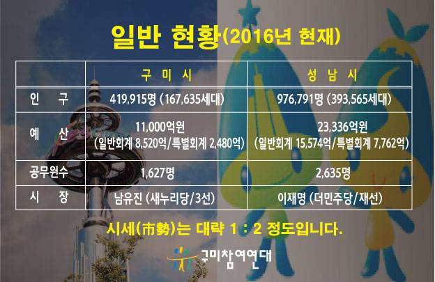 | ▲ 구미시와 성남시의 일반 현황. 규모로는 성남이 구미의 두 배다. 그러나 나머지 지표는 비교가 되지 않을 정도다. |