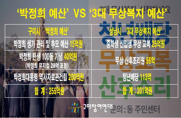 성남시의 '3대 무상복지' 예산은 규모로 보면 구미시의 '박정희 관련 예산'과 비교할 만한 수준이다. 중학교 신입생 무상 교복 25억, 무상 산후조리원 56억, 청년배당 113억 등 합계 201억인데 구미시는 앞에 밝혔듯 박정희 관련 예산이 255억에 이르는 것이다.