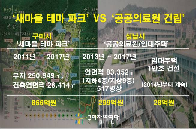 | ▲ 구미시에선 새마을 테마 파크에 866억원을 쓰고 성남시에선 공공의료원 건립에 299억을 쓸 계획이다. |