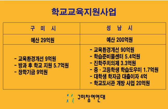 | ▲ 학교교육 지원사업의 차이도 크다. 성남시는 구미시보다 교육환경개선 사업 예산이 10배나 많다. |