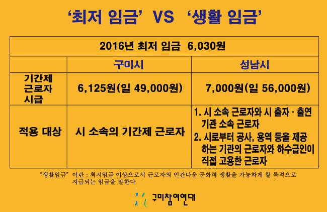 | ▲ 기간제 근로자 시급에서 구미시는 최저임금을, 성남시는 생활임금을 지급한다. 그 적용대상도 비교가 안 된다. |