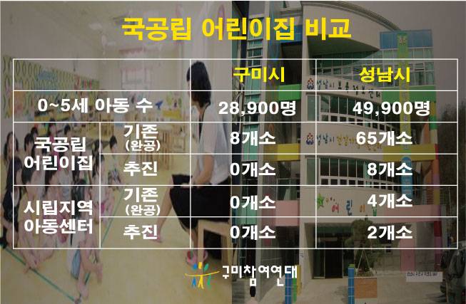 국공립 어린이집에서도 두 도시의 차이는 크다. 구미시엔 8개가 있는 국공립 어린이집이 성남에는 65개소고, 8개소가 설립을 추진 중이다. 구미엔 없는 시립 지역아동센터가 성남엔 이미 4개소가 있고, 2개소가 개원을 준비하고 있다. 0~5세 아동 수의 차이(2만8900 : 4만9900)를 감안해도 두 지역의 거리는 너무 멀어 보인다.