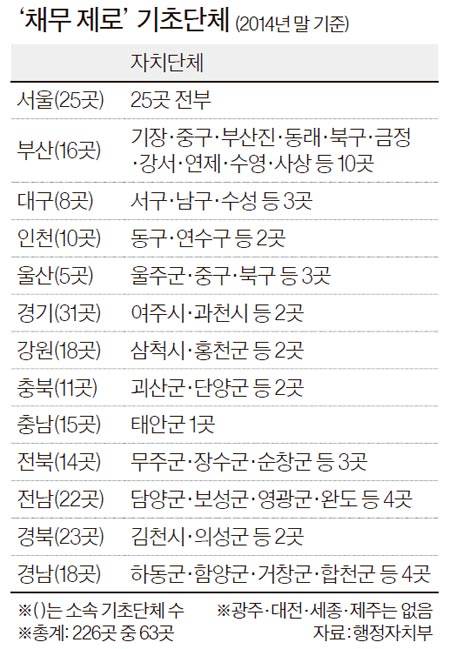기초자치단체의 채무 제로 선언도 잇따르고 있다. 경기도 부천시는 지난 1월 지방채 잔액 677억원을 모두 상환했다. 강원도 화천군도 지난 2월 지방채 60억원을 모두 갚았다. 경북 고령군은 지난 4월부터 빚이 없다. 2014년 말 기준 부산은 16개 구·군 중 10곳, 전남은 22개 시·군 중 4곳이 채무 제로다.