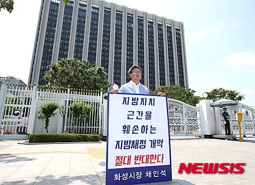 【화성=뉴시스】정재석 기자 = 정부의 지방재정개혁안에 반대하는 경기 수원, 성남 등 6개 불교부단체장들이 릴레이 1인 시위에 들어갔다.