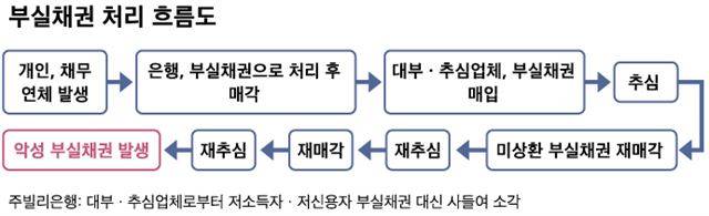 그런데 어떻게 이틀치 세비(8,179만원)로 123억원의 빚을 탕감할 수 있었을까. 여기엔 부실 채권의 복잡한 시장 구조가 얽혀 있다. 금융기관은 채무자가 연체를 거듭하면 이를 부실 채권으로 처리하고 원가보다 저렴한 가격에 외부 기관에 매각한다. 이를 매입한 대부ㆍ추심 업체 등은 채무자를 상대로 추심에 나서고, 이후 추심에 실패한 채권을 다시 판다. 이런 과정을 반복하면서 부실 채권은 사실상 상환이 불가능한 ‘악성 채권’이 된다. 그러나 또 다른 대부ㆍ추심 업체들은 이를 채권 원금의 1~5%의 헐값에 사들여 마지막 추심에 나선다. 100만원짜리 채권을 5만원에 매입해 10만원만 받아내도 2배 수익을 거두게 되는 업체들은 채권 소멸 시효 5년도 무시한 채 당사자는 물론 가족을 상대로 협박성 상환 독촉에 나서게 된다. 더민주는 “실제로 한 여성 채무자가 15년 전 갚지 못한 카드 빚 80만원을 까맣게 잊고 있다가 딸이 지켜보는 앞에서 상환 독촉의 봉변을 당한 사례가 있다”고 전했다.