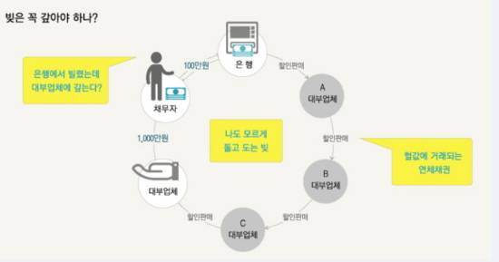 | ▲ 은행으로부터 100만원을 빌린 A씨. 은행은 연체된 A씨의 채권을 대부업체에 값싸게 넘기는데, 몇 손을 돌고 돌아 50원에 이 채권을 인수한 추심업자는 장기 연체이자를 포함한 1000만원을 A씨에게 받아내려 한다. ⓒ 에듀머니 홈페이지 |
