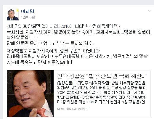 이재명 성남시장은 4일 자신의 페이스북을 통해 "내 맘대로 안되면 없애버려..2016에 나타난 박정희 독재망령"이라고 적었다.