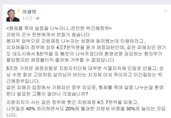 이 시장은 "5조원 가까운 재정강탈로 지방자치단체 대부분 식물지차체 인질로 만들고, 성남 수원 화성 고양처럼 살아남아 버티는 지자체 마저 죽이려고 이간질하는 박근혜정부입니다"라고 했다.