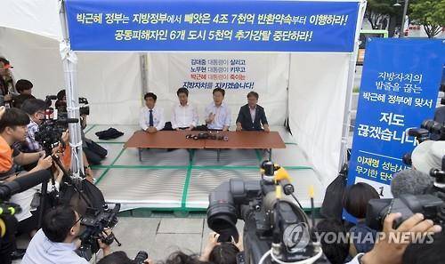 이재명 성남시장, 염태영 수원시장, 채인석 화성시장 등 3명은 7일 오전 11시 서울 광화문 광장에서 공동기자회견을 열고 "정부의 지방자치 죽이기에 맞서 싸우겠다"며 단식농성을 시작했다.