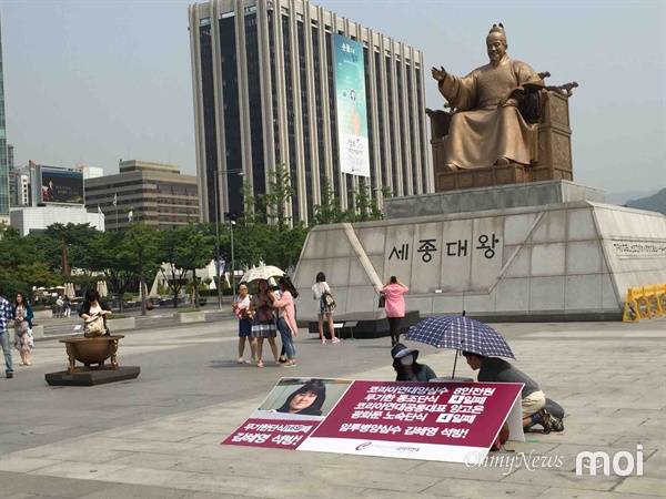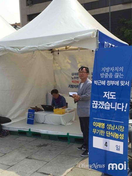 6월항쟁 29주년인 10일 서울 광화문 광장. 박근혜 정부의 '지방재정 개혁'에 맞서 이재명 성남시장이 4일째 단식 노숙 농성을 이어가고 있습니다. 바로 옆 세종대왕상 앞에서도 코리아연대가 4일째 단식 노숙 농성중인데요.