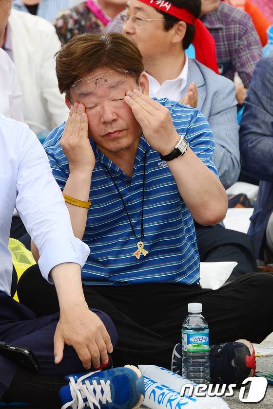 (서울=뉴스1) 임세영 기자 = 11일 오후 서울 광화문광장에서 열린 '지방재정개악 저지와 지방자치 수호를 위한 시민문화제'에서 단식투쟁에 나서고 있는 이재명 성남시장이 피곳한듯 얼굴을 만지고 있다. 이날 행사에는 정부가 발표한 지방재정 개편안이 추진될 경우 재정에 직격탄을 맞게 되는 경기지역 6개 도시(수원ㆍ성남ㆍ용인ㆍ고양ㆍ화성ㆍ과천) 비상대책추진협의회가 주최했다. 2016.6.11/뉴스1