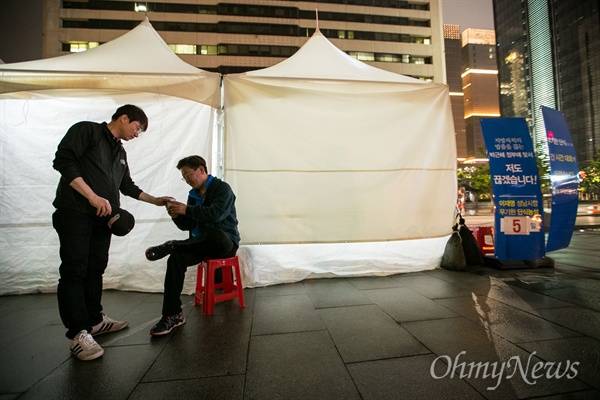 지방재정 개편안 철회를 촉구하며 이재명 성남시장이 무기한 단식투쟁을 시작한지 5일째인 11일 오후 서울 광화문광장에 마련된 농성장에서 보좌진에게 소금물을 건네 받고 있다.