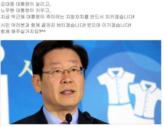 이 시장은 "김대중 대통령이 살리고, 노무현 대통령이 키우고, 지금 박근혜 대통령이 죽이려는 지방자치를 반드시 지키겠습니다!"라며 "시민 여러분과 함께 끝까지 버티겠습니다! 웃으며 이기겠습니다!"라고 했다.