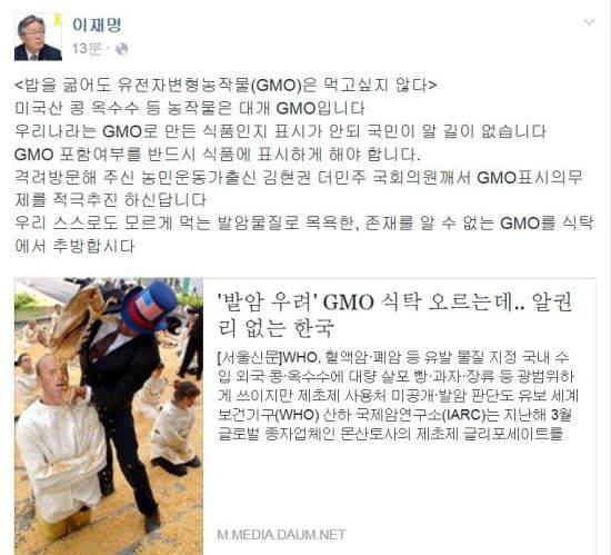 이재명 성남시장은 13일 자신의 페이스북을 통해 "밥을 굶어도 유전자변형농작물(GMO)은 먹고싶지 않다"라고 적었다.
