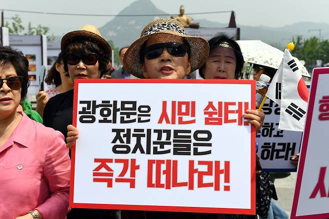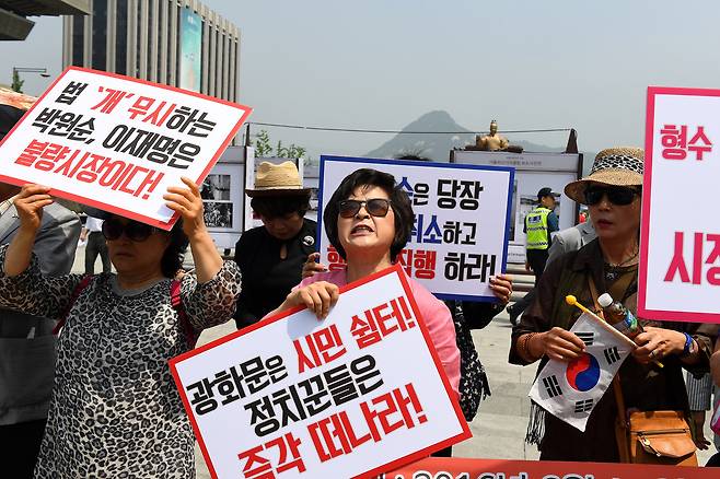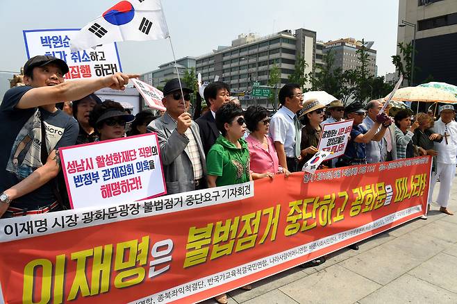 | ▲ 대한민국애국시민연합 등 보수단체 회원들이 14일 오전 서울 종로구 광화문 광장에서 지방재정 개편 추진에 반발해 8일째 단식농성 중인 이재명 성남시장이 "광장을 불법점거했다"며 "농성 중단"을 요구하고 있다. |