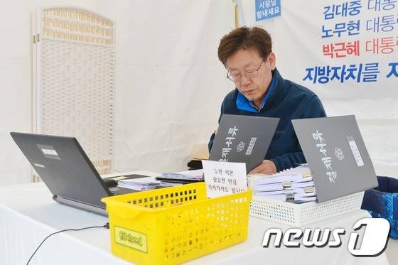 (서울=뉴스1) 민경석 기자 = 단식 9일째를 맞는 이재명 성남시장이 15일 오후 서울 광화문광장에 마련된 단식농성장에서 시정업무를 보고 있다.